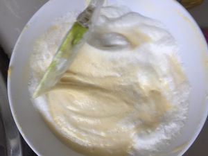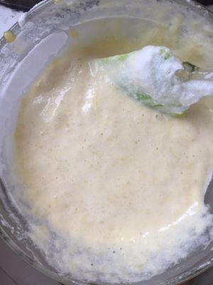 分三次加入蛋液到蛋黄中,刮刀上下搅拌均匀,一定要上下搅拌,不能画圈搅拌哦
