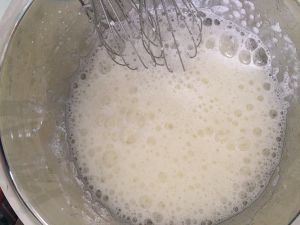 第三次加入糖粉,蛋清变得细腻,提起打蛋器垂直滴落。