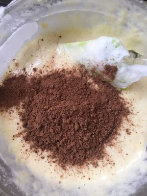 放入可可粉,搅拌均匀,也是用刮刀上下搅拌哦