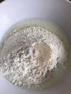 放入低粉,酵母,盐,用刮刀搅拌均匀