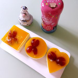 加热芒果浓汁放入吉利粉搅拌至完全融化,晾凉。取出慕斯蛋糕,加上水果装饰后,将果胶汁倒在凝固好的慕斯蛋糕上。放入冰箱,冷藏至镜面果胶层凝固即可。