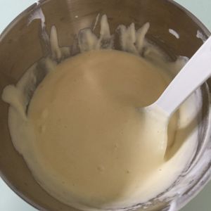 混合好的液体中加入三分之一打发好的奶油,轻拌使其均匀,再反倒回剩下的奶油中,轻拌均匀成为慕斯液。