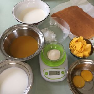 淡奶油加15克糖打发至拿起打蛋器奶油会缓慢向下流。芒果肉打成泥放入芒果汁搅匀备用。鲜奶加砂糖15克加热至糖化后,使其稍凉,慢慢倒入打散的蛋黄,快速搅拌至变成浓稠的汁。微火加热蛋奶汁倒入吉利粉搅拌至融化离火,再加入先前备好的果珍浓汁芒果丁混合液,拌匀。
