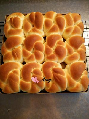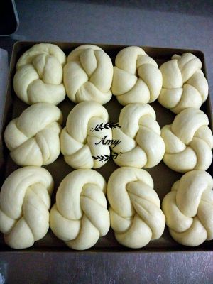将长条对折,顺着一个方向扭三下,然后对折,把尾巴塞下去,依次整理好剩下的,排入28厘米的烤盘中