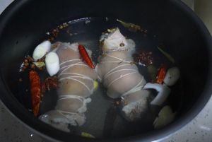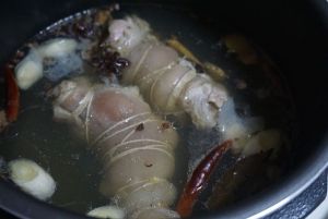 选择蹄筋这档,大概30分钟。这个时间,肘子完全熟了。这个步骤只放香料,不要放什么老抽、生抽,做水晶肘子,不要放带颜色的调料。