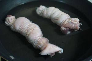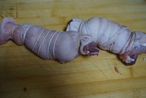 由于要上锅高压,所以把捆好的肘子分成两个比较好。不要觉得现在肘子粗粗细细这么丑,一会儿咱们还有整形的步骤,所以这一步就是要把肘子捆结实,千万别散。