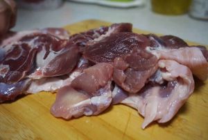 一个后肘,去掉中间的骨头,把皮上的猪毛和表面的一层薄薄的油脂去掉。肘子肉平铺在案板上。