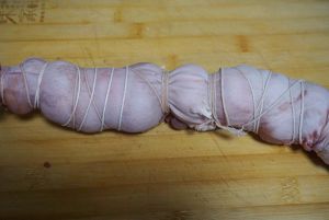 最重要的一部就是卷肘子,一个人很难完成,两个人配合,一个人卷肉一个人捆就比较方便。