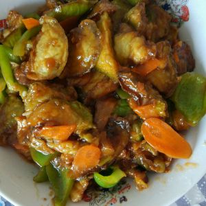 放上水,番茄酱、盐、酱油、淀粉、蒜、调成汁,炸熟的茄子倒锅翻炒装盘