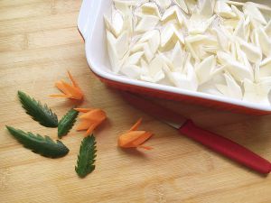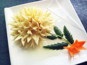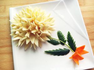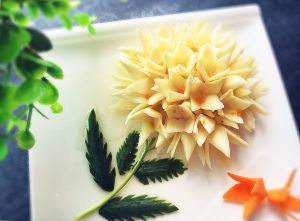 削好的花瓣泡在清水里。之后又用黄瓜皮做了几片叶子。