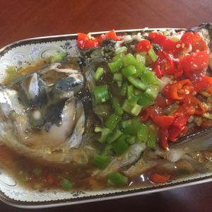 装盘后在鱼头上面放上红绿椒,上蒸锅蒸约15分钟