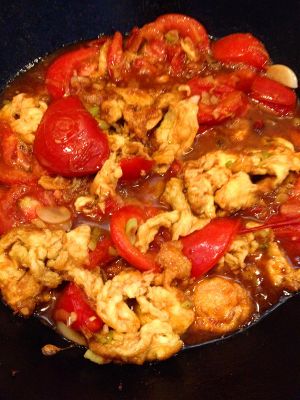 锅内放油炒香葱姜蒜,下入西红柿炒出汤汁后放入鸡蛋和调味料烧制