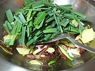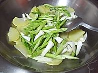 油热后,放入土豆片,炒熟,再放入蒜苗部分炒出香味儿后,盛出备用
