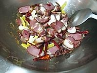 油再次烧热后,放入干辣椒,花椒,姜片,蒜片爆出香味