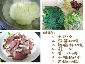 再放入腊肉炒匀,之后倒入炒熟的土豆和蒜苗炒匀