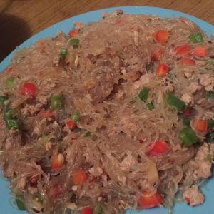 油锅热后翻炒肉末及葱姜蒜至八分熟,然后加入粉丝,领取一碗调入少量生抽,胡椒粉,蚝油,盐,孜然,五香粉,及少半碗水,加入锅中翻炒,最后加入青红椒,出锅前少量鸡精,炒熟出锅即可