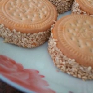 取出2片饼干,在一片饼干上放好南瓜泥,另一片叠上去,周边用勺子或者手抹均匀,方便等下滚芝麻