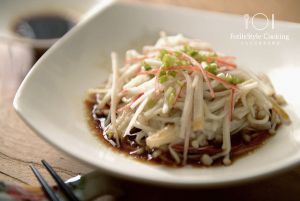 金针菇200克,蟹肉棒200克,葱5克,麻油10ml