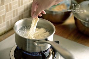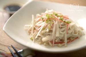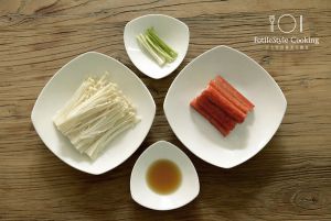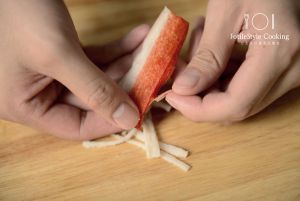 将蟹肉棒撕成丝。将金针菇切去根部,放入盐水中泡一下。