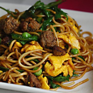 炒锅入花生油、放入葱和鸡蛋翻炒 再倒入切成片的肉圆片和豌豆同炒装出