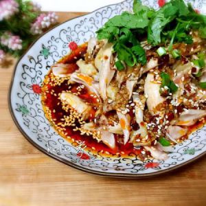 调料:大蒜三四颗研碎,生抽、白糖、花椒粉(或花椒油)、味精、鸡精、自制辣椒油、一勺鸡汤拌匀,淋在手撕鸡上