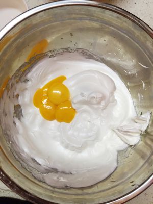 加入蛋黄,打蛋器低速打两分钟,打至蛋液有点点流动性就可以了