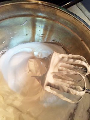 鸡蛋:蛋白跟蛋黄分离,分三次加入细砂糖,打成硬性发泡。(如图:打蛋器提起短而直立的角)