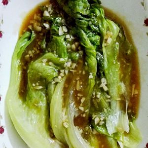 先煮一锅水将生菜烫熟后撩上来放入盘中,再热油将剁碎的蒜头炒一下加入调好的蚝油和生粉水鸡精炒一下淋到生菜上面就可以了