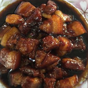 冰糖下锅炒至融化,把切好的三层肉倒入锅中