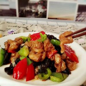 放入肥肠,青红椒,木耳。翻炒几下即可。