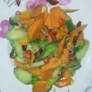倒入切好的黄瓜胡萝卜,大火翻炒一分钟后盛出备用