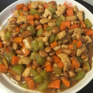 炒好胡萝卜黄瓜丁倒入鸡胸肉炒一会,最后把勾芡好的汁倒入锅中。备注:勾芡的汁做法,加入水,生粉,酱油,白糖,醋即可