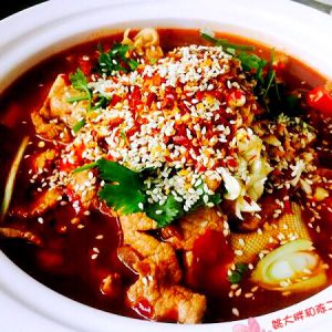 热锅冷油,放入葱姜蒜、郫县豆瓣炒出红油,倒入一升冷水煮沸,一片片放入肉片,两分钟左右捞出,并在盘中浇上汁,将香菜、辣椒面、蒜末、白芝麻放入,淋上热油就出锅了!