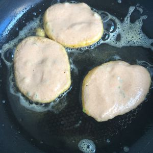 小火,煎至两面金黄就可以了,我家宝宝一岁半,爱吃的不得了,开始做三个一出锅还没拍照就要吃,一会就吃完了