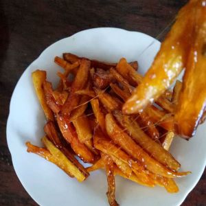 翻炒,使每根地瓜条粘上糖浆。出锅装盘