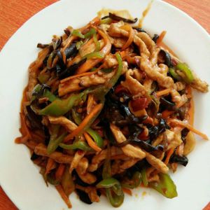 加郫县豆瓣酱再加胡萝卜辣椒木耳翻炒一会加鱼香汁快熟的时候加入水淀粉然后出锅