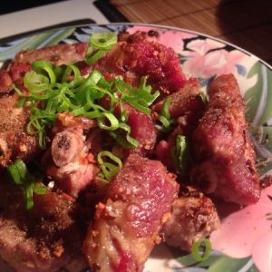 热油,下排骨煎到皮发黄(由于高压锅煮过,最后就是外脆里嫩啦)下椒盐翻炒,装盘撒葱花,完成!