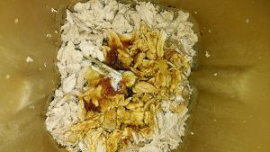 把擀散的肉放入面包机料理桶里面,同时加入酱油,生抽,白糖,橄榄油