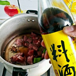 把肉块,姜,八角,加油少许料酒用压力锅压十分钟,用压力锅可以让肉更软一些,利于擀散。