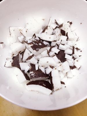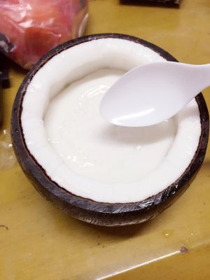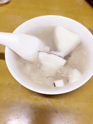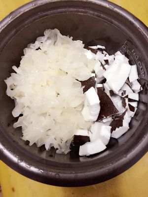 银耳冷水泡一个小时,洗净撕小块、将椰肉银耳同锅煮一个半小时