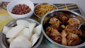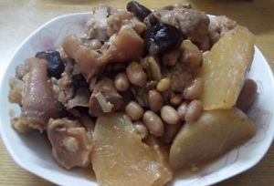 把准备好花生倒入电饭锅底,中间放切好的萝卜,然后倒入腌制好的猪蹄(包括腌料),加适量水,然后按煮饭功能