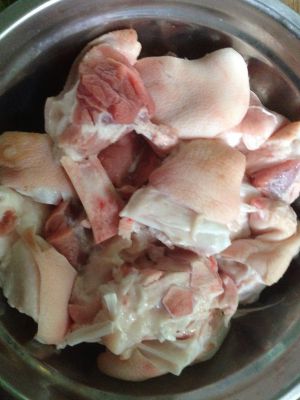 猪蹄加入姜片、冬菇、生抽、老抽、白糖、料酒和盐腌至30分钟