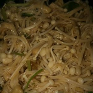 切香菜,剁蒜子,加白醋,加酱油,一起加到金针菇上。(上图的金针菇拍时还没倒水,加材料前记得倒水!!!)