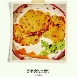 平底锅刷上油,放入土豆饼(捏成需要的大小即可),用小火慢慢煎,一面金黄后翻面再煎