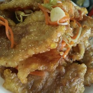 猪肉切大概2~3cm的片 如果不知道大概多厚 就想想外面吃的多厚 盆里加入水和淀粉搅拌均匀放入肉片 泡一会儿 我这张照片是肉刚放里面