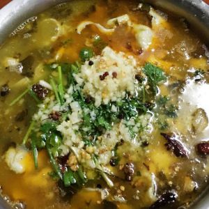 然后起油锅加入花椒干辣椒适量蒜末,炒至出香淋在酸菜鱼上即可