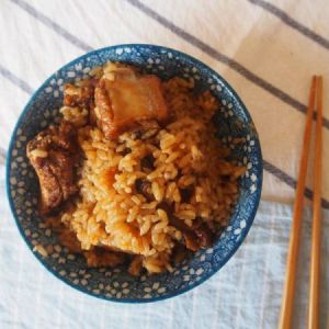 把做好的排骨倒入米饭锅内,加入够焖米饭的水,大火煮10分钟