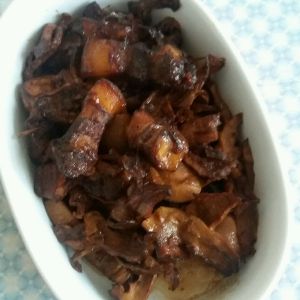 倒入料包,竹笋,鹌鹑蛋,橄榄和陈皮,翻炒一下。料包在超市买的,水平高的可以自己调制,初级水平卖现成的保险。翻时要小心,鹌鹑蛋易碎,只要都沾上颜色即可。放点料酒,盐,慢火炖一小时,肉烂即熟了。
