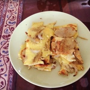 洋葱,土豆片炒香后加入蛋液,小火,至表面没有流动液体翻面