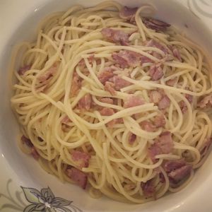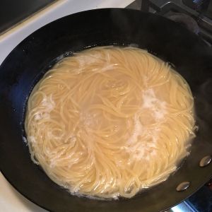 将沥过水的面倒入锅中,翻炒。1秒中,牛奶即吸干,装盘。